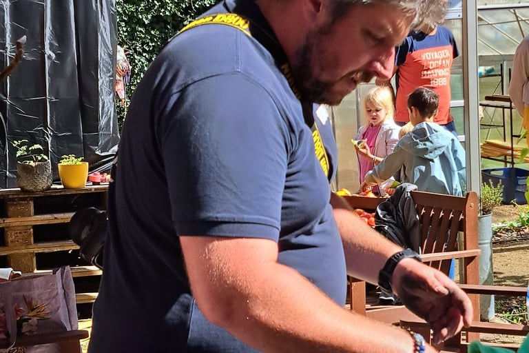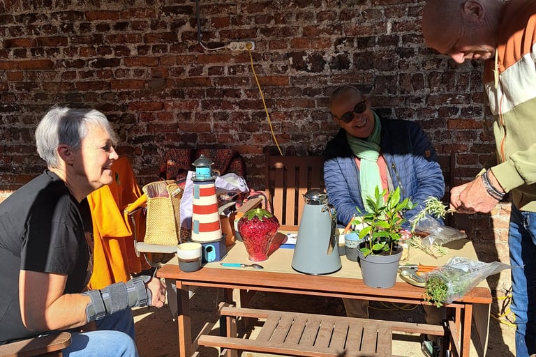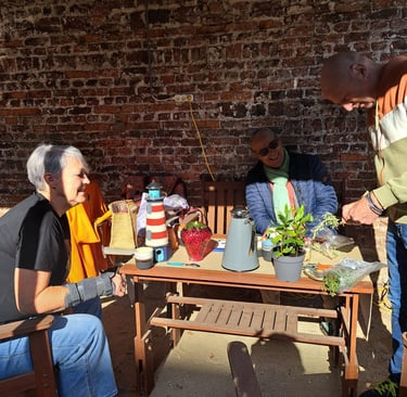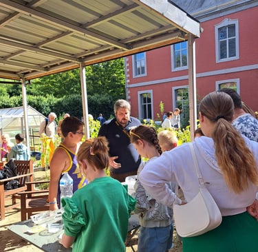 Dans la continuité de ce thème, notre jardin a proposé un autre visage du patrimoine : celui de la gastronomie du quotidien, enracinée dans la terre et portée par la solidarité. Les visiteurs ont découvert nos plantations de légumes, nos herbes aromatiques et l’organisation collective qui fait vivre ce lieu. Chaque récolte raconte une histoire de patience, de coopération et de partage : une gastronomie simple mais authentique, née de la proximité avec la nature. Pierre-Yves animateur de chez Natagora s'est occupé de l'atelier "Bombes à graines" pour les enfants, un atelier où les plus jeunes (et pas que) ont pu fabriquer des boulettes de terreau, d'argile et de graines destinées à être lancées là où la nature en a besoin (terrain vague, friche, îlots urbains, etc...). Cet atelier a eu un franc succès.
