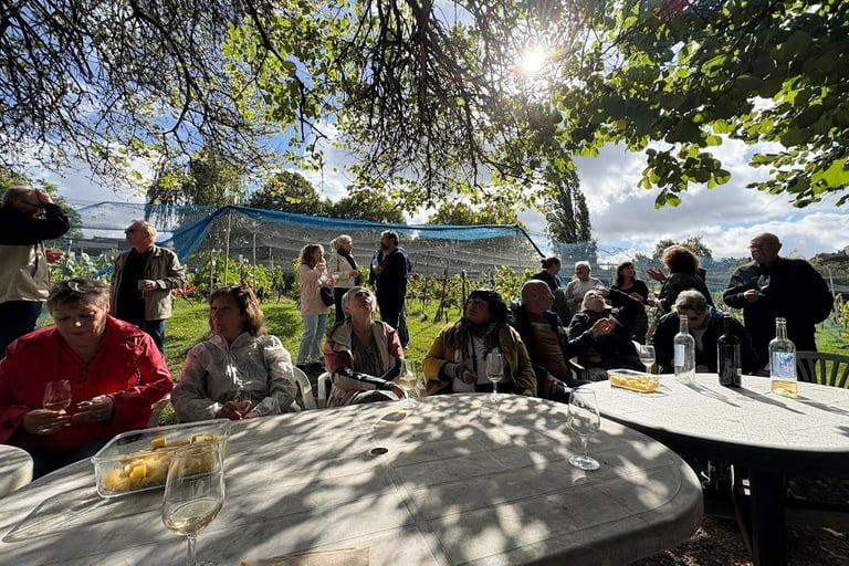 Un vingtaine de participants invités par le syndicat d'initiative de Seraing, en collaboration avec le "centre culturel" de Seraing et la "ceinture aliment-terre liégeoise" furent heureux de découvrir cette expérience et ont pu écouter les explications , donnée par un responsable, sur les débuts de l'activité et sur les difficultés auxquelles ils ont du faire face. Visiter ce vignoble nous a ramener à un patrimoine oublié et à une époque où la vallée de la Meuse fût une grande productrice de vin , en effet dès le haut Moyen Âge, la vallée de la Meuse réunit les conditions idéales pour la viticulture : exposition au sud, pentes favorisant l’écoulement de l’eau, sols calcaires et schisteux. Les abbayes et chapitres religieux furent parmi les premiers acteurs à planter la vigne, afin d’assurer l’approvisionnement en vin de messe et en boisson quotidienne. Les sources médiévales mentionnent de vastes vignobles autour de Liège, Flémalle, Huy et jusqu’à Namur (1).